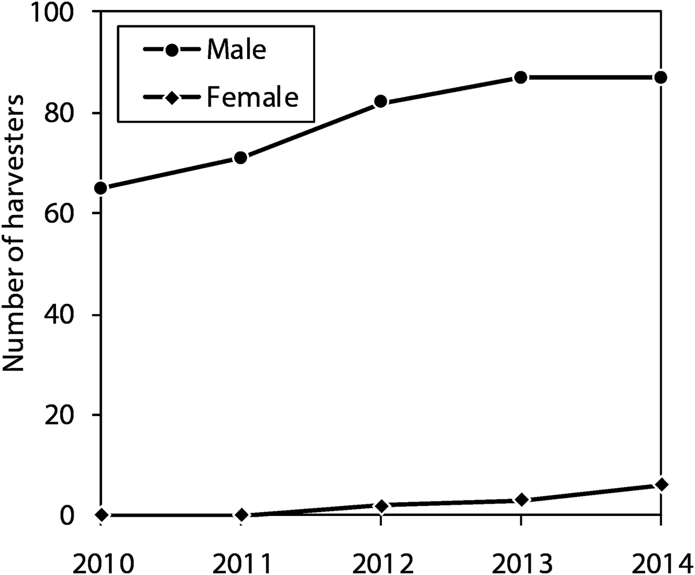 Fig. 6 Trends in the number of yarsagumba harvesters (male and female) in surveyed households in Garjyangkot village, Jumla district, Nepal (Fig. 1) during 2010–2014.