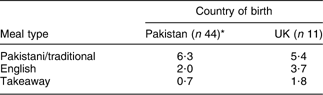Table 2 Mean number of times per week the participants reported to eat Pakistani meals, English meals or takeaways, according to country of birth: Pakistani women, Greater Manchester, UK