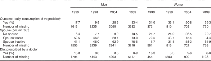 Fig. 1 provides a flowchart for the selection of participants in the study. The population included 12 942 men and 2739 women. Descriptive statistics and the number of missing values for men and women are presented in Table 1 (baseline characteristics) and Table 2 (time-varying variables). As the company has specific rules on retirement, retirement occurred on average at age 55 years. The average year of retirement was 1999 for men and 2000 for women. In the cohort, a higher proportion of women ate vegetables every day over the entire follow-up period, had a low educational level and were single (P<0·001). Among the available cases (respondents who completed the questionnaires in a given year), between 1990 and 2009, the daily consumption of vegetable increased from 17·7 to 33·4 % for men and from 31 to 55·3 % for women. The proportion of individuals without a spouse increased for both sexes. Crude associations between the repeated measurements of vegetable consumption are presented in the online Supplementary material.
