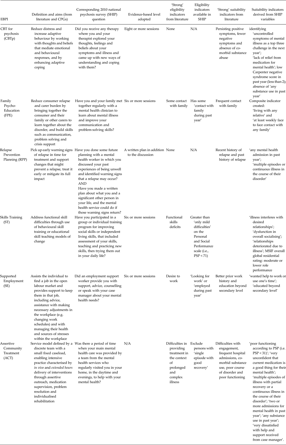 Table 1. Six evidence-based psychosocial interventions (EBPIs): definitions, corresponding SHIP survey questions and respective eligibility and suitability indicators according to peer-reviewed literature and available national psychosis survey variables