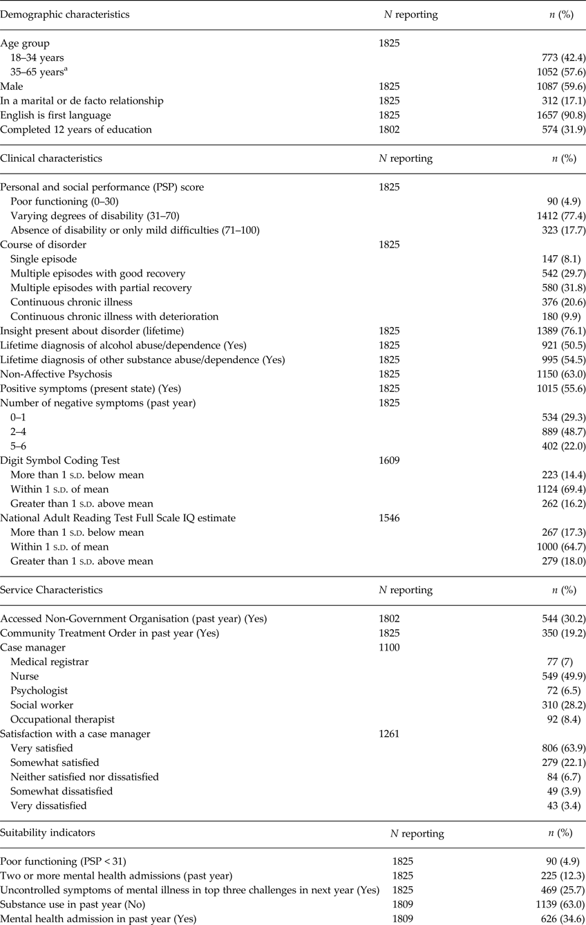 Survey participants were predominantly single (61.2%) and male (59.6%). Less than one third (31.5%) had completed the final year of schooling and almost one third (32.7%) were in paid employment at some time during the year prior to the interview. Most (63.2%) had obvious or severe dysfunction in their capacity to socialise over the past year. Almost half had a diagnosis of schizophrenia (47.0%) and most had experienced multiple episodes of psychosis with periods of good or partial recovery between (61.5%) (for a detailed description of the overall sample: Morgan et al. Reference Morgan, Waterreus, Jablensky, Mackinnon, McGrath, Carr, Bush, Castle, Cohen, Harvey, Galletly, Stain, Neil, McGorry, Hocking, Shah and Saw2012). Table 2 presents demographic, clinical and service characteristics, and suitability indicators for participants.
