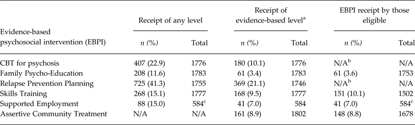 There is little international data about receipt of EBPIs. A systematic review of UK studies addressing implementation of national recommendations (Ince et al. Reference Ince, Haddock and Tai2016) found reported rates from 4% to 100% for CBT and 0% to 53% for Family Interventions, with heterogeneity too great to allow aggregation of results. Availability appears to be limited (Harris & Boyce, Reference Harris and Boyce2013; Haddock et al. Reference Haddock, Eisner, Boone, Davies, Coogan and Barrowclough2014), except in mental health services that have systematic implementation programs (e.g. McHugo et al. Reference McHugo, Drake, Whitley, Bond, Campbell, Rapp, Goldman, Lutz and Finnerty2007). Most studies audit conformance with CPG recommendations using clinical files (e.g. Lehman & Steinwachs, Reference Lehman and Steinwachs1998; West et al. Reference West, Wilk, Olfson, Rae, Marcus, Narrow, Pincus and Regier2005) or through service provider reports (e.g.Magliano et al. Reference Magliano, Fadden, Economou, Xavier, Held, Guarneri, Marasco, Tosini and Maj1998; Fadden et al. Reference Fadden, Birchwood, Lefley, Johnson, Lefley and Johnson2002; Kim & Salyer, Reference Kim and Salyer2008). We are not aware of studies seeking patient reports of EBPIs for psychoses, other than the Rethink survey in the UK, reported by Ince et al. (Reference Ince, Haddock and Tai2016), which sought self-reports about receipt of CBT without specifying the definition of the treatment or duration. Further, we are unaware of systematic enquiries about the extent of receipt of EBPIs within larger population-based samples; information that is particularly helpful for national policy and funding.