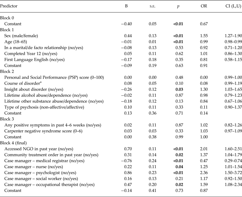 Given the nature of ACT as a service type rather than a discrete psychosocial intervention as were the other EBPIs, we re-ran the model excluding ACT. The overall level of prediction improved slightly (67.8% of cases compared with 66%) although R2 estimates reduced. The predictors remained unchanged except for ‘case manager – nurse’ and ‘community treatment order in the past year’, which were no longer statistically significant.