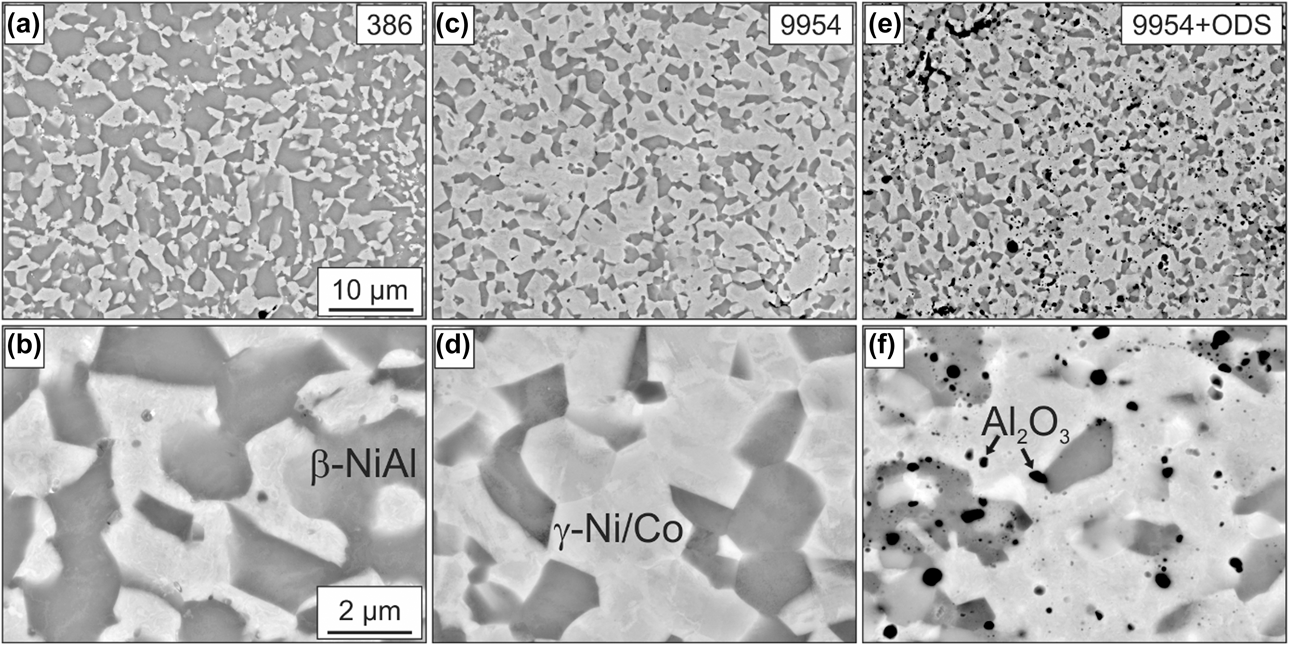 The two-phase microstructure of Amdry 386 and 9954, after the first annealing step of 2 h at 1100 °C, consists of β-NiAl (dark), γ-Ni/Co-solid solution (bright), and an additional third phase (Al2O3) in the case of the 9954 + ODS coating, as shown in Fig. 1.