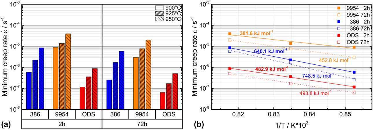 Q is the activation energy, which can be calculated as the slope of the minimum creep rate against the inverse temperature and the gas constant R. Amdry 386 shows the highest activation energy followed by Amdry 9954 + ODS. Amdry 9954 showed the strongest creep deformation at all testing temperatures, which corresponds to the low activation energy of creep.