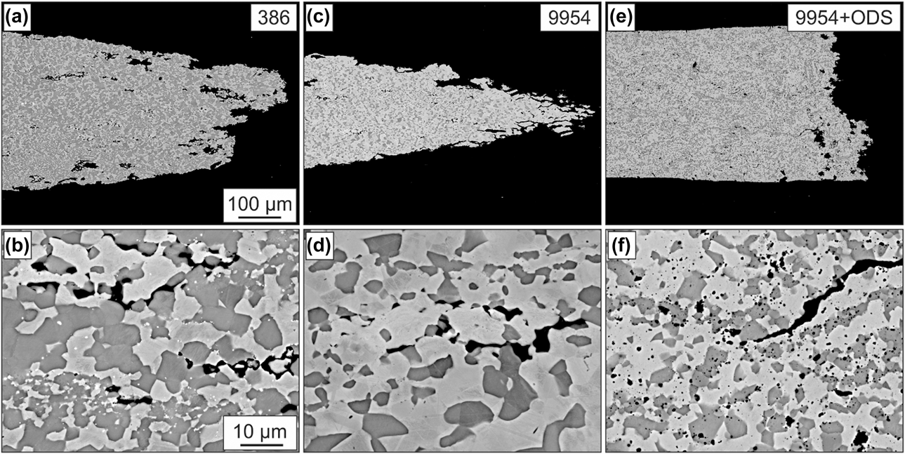 Figure 5: BSE images of the microstructures of Amdry 386 (a + b), 9954 (c + d) and 9954 + ODS (e + f) after 72 h of thermal exposure and microtensile creep tests at 950 °C.