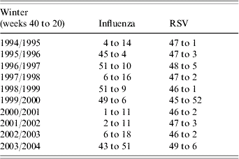 Table 1. Influenza and respiratory syncytial virus (RSV) active periods by week number