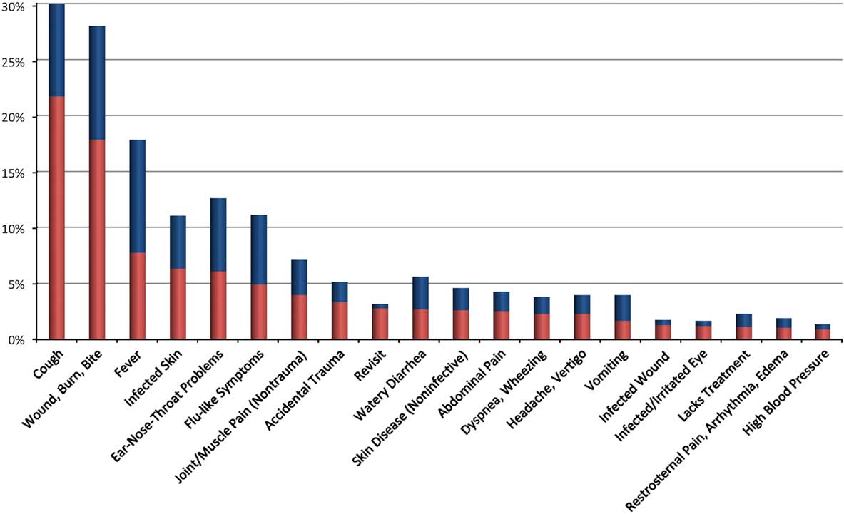 Figure 1 Twenty Most Common Primary (Red) and Secondary (Blue) Complaints Expressed by the Patients (% of All Patients).
