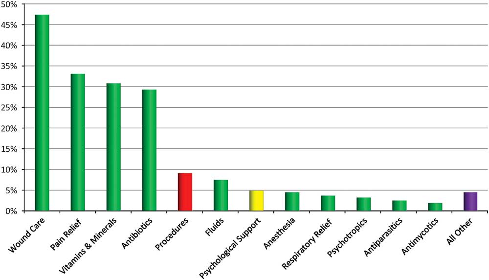Supplies, materials, infusions, and drugs were mainly retrieved from preconfigured IEHKs. These do not contain oxygen or antidiabetics, as these supplies come in separate additional kits or have to be added from other supplies. As demonstrated in Figure 4, the most-used treatment was wound care in general (rinsing, disinfection, local antibiotics and povidone-iodine, dressings, sutures or stitching, sulfadiazine), followed by pain relief (paracetamol, nonsteroidal antiinflammatory drugs, opioids in oral and parenteral forms, and anesthetic gels for wounds), the distribution of vitamins and minerals (from the IEHK: zinc, iron, vitamin C), and antibiotics (most patients received narrow-spectrum oral antibiotics, except for the surgical patients, who received intravenous broad-spectrum antibiotics). Antiparasitic drugs and antimycotics were used for 3% and 2% of patients, respectively. Respiratory relief was mainly achieved by the use of bronchodilators. Procedures were performed on 9% of patients (n=115), including 15 major and 30 minor surgical interventions. Forty-two patients had to be transferred to secondary care hospitals for complex surgery, transfusions, and intensive postoperative care. In the field hospital, anesthetics were only used in patients undergoing surgical procedures. Psychological support was delivered to 5% of patients (n=62), and psychotropic drugs to 41 (3%).