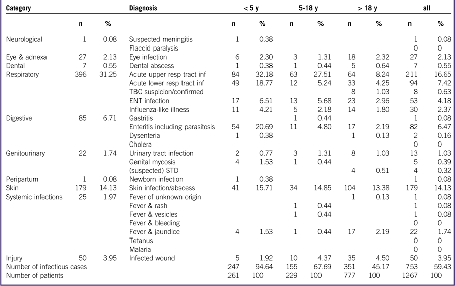 Table 1 and Figure 3 indicate the distribution of diagnostic categories. The most frequent were respiratory disorders (31%), injury (28%), skin (11%), and digestive (8%). Fifty-one (4%) patients presented with infected wounds. In 12 cases (1%) there was no actual medical or mental diagnosis, but the patient was in search of routine daily medication or requested personal attention.
