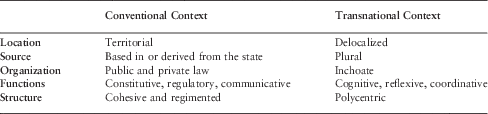These reflections convey a first impression of the destabilizing impact of transnational regulatory activity on assumptions about legal governance. However, the examples still underplay the essentially disruptive impact of TER on the very concept and content of law. Law, in the preceding example, is talked of as the pre-existing governance regime under which the Covenant resorts. The latter is portrayed, for all intents and purposes, as the passive subject that undergoes law and adjudication. Yet, if we embrace the notion that the Covenant produces behaviour that is at least in part regulatory, then the normative content actively developed through Covenant processes may itself be a source of law. The Covenant does not merely operate in an intricate legal context; it creates an intricate legal context.Footnote 19 Transnational, decentred regulation thus co-produces transnational, decentred law. Moreover, this transnationalization of law calls into question the usefulness of many of the attributes that conventionally serve to distinguish law from non-law.Footnote 20
