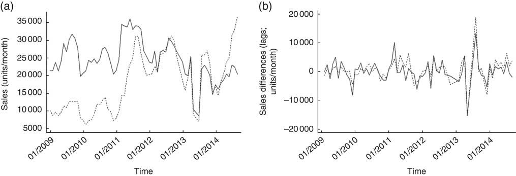 Based on the results of the sensory discriminatory test, the ‘pan francés’ bread containing 0·40 g of salt per unit (i.e. 16 g of salt/kg of flour, a reduction of 20 % in the salt content) was introduced because was not discernible from the regular ‘pan francés’ bread. The variation in bread sales and first-order differences in sales are shown in Fig. 2(a) and 2(b), respectively.
