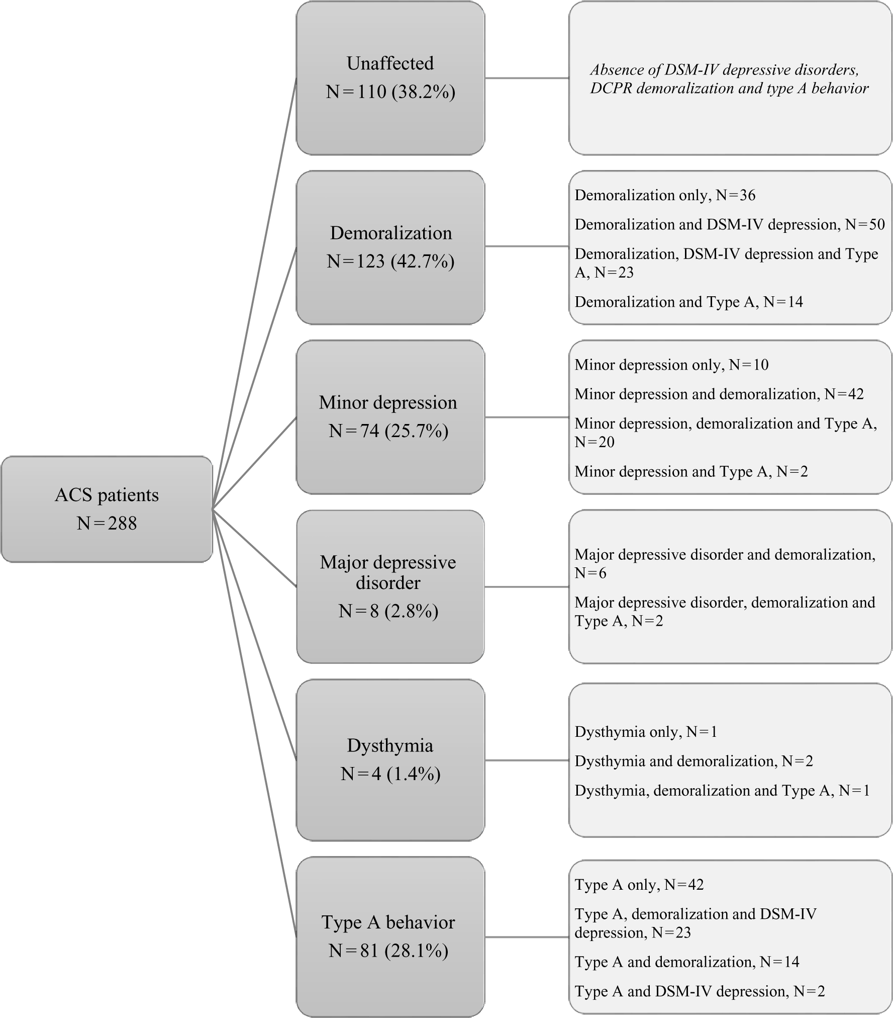 Figure 1. Prevalence of DSM-IV-TR depressive disorders (major depressive disorder, minor depression, and dysthymia), DCPR demoralization and Type A behavior in ACS patients. ACS, acute coronary syndrome; DCPR, diagnostic criteria for psychosomatic research.