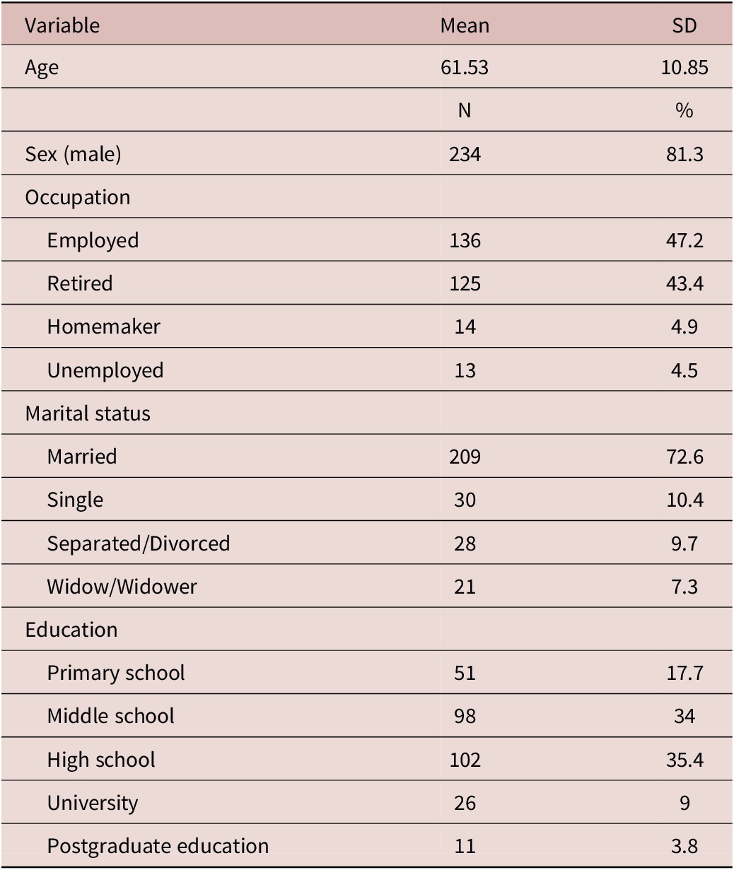 Descriptive sociodemographic characteristics of the study population are presented in Table 1. The sample included mainly men (81.3%) with a mean age of 61.53 years (SD = 10.85), ranging from 33 to 86 years. Most of the participants were employed (47.2%), married (72.6%) and had a high school diploma (35.4%).