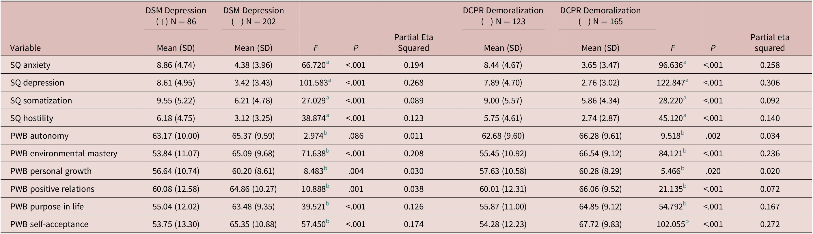 Concerning DCPR demoralization, multivariate analyses of variance indicated that the presence of this syndrome was significantly associated with higher scores in all SQ scales (all P values < .001), as well as with lower scores in all PWB dimensions (from P = .020 to P < .001) (Table 3).