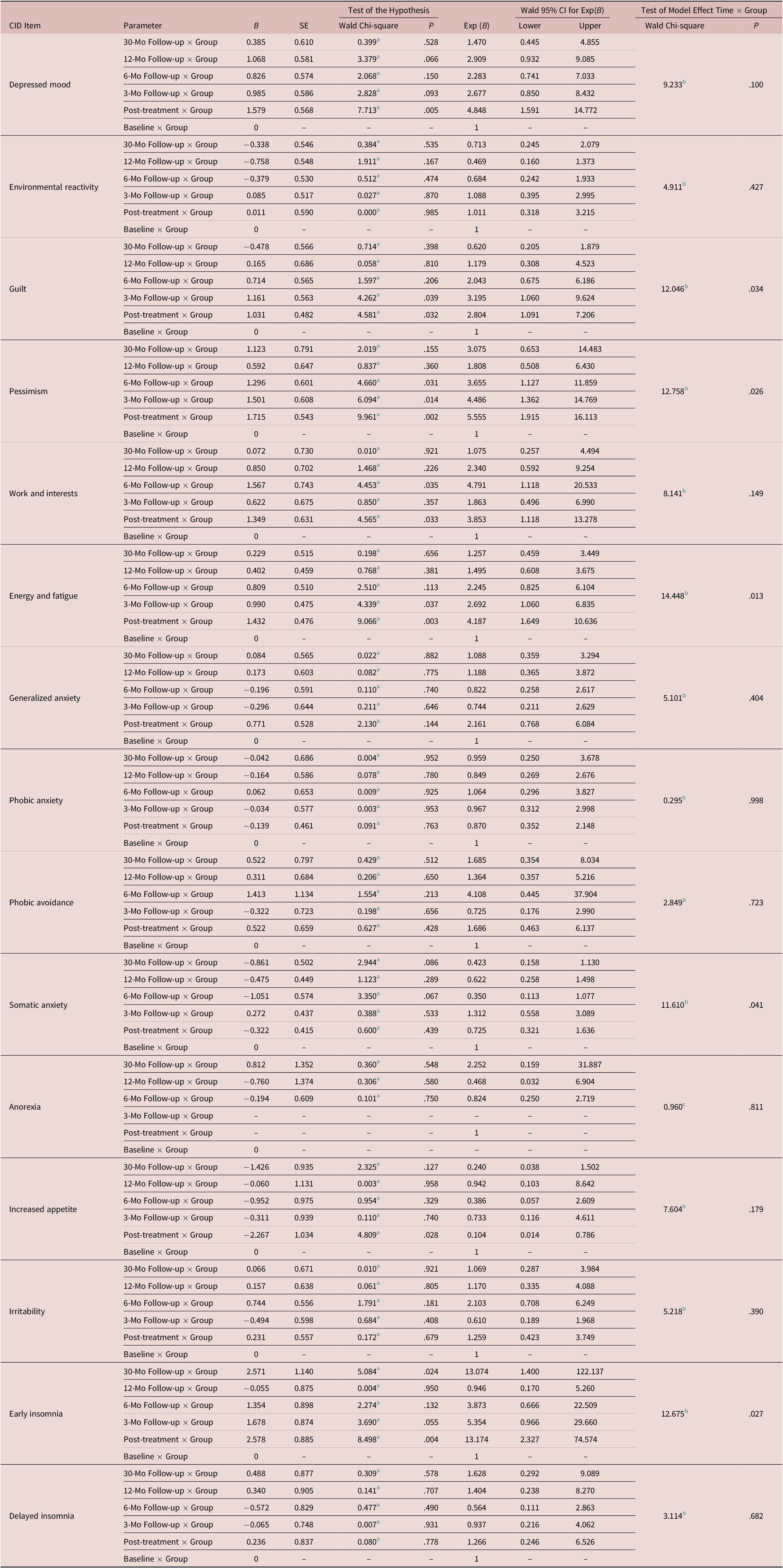 Specifically, the sequential intervention (CBT/WBT) was significantly related to decreased feelings of guilt (Wald Chi-square = 4.58, df = 1, P < .05; Exp(B) = 2.80, 95%CI: 1.09-7.21) and pessimism (Wald Chi-square = 9.96, df = 1, P < .01; Exp(B) = 5.56, 95%CI: 1.92-16.11), from baseline to post-treatment (both P < .001), with benefits maintained up to 30-month follow-up. Moreover, CBT/WBT was significantly associated with a reduction of somatic depressive symptoms, such as low energy/fatigue (Wald Chi-square = 9.07, df = 1, P < .01; Exp(B) = 4.19, 95%CI: 1.65-10.64) and early insomnia (Wald Chi-square = 8.50, df = 1, P < .01; Exp(B) = 13.17, 95%CI: 2.33-74.57), from baseline to post-treatment (P < .001 and P = .011, respectively), with benefits maintained up to 12-month follow-up in the first case, and fluctuating over time in the case of insomnia (from 3- to 12-month follow-up: P > .05; 30-month follow-up: P = .016). The only exception was somatic anxiety, in which a significant reduction of symptoms was observed in CM group only between baseline and post-intervention (P = .031) with benefits maintained at subsequent follow-ups, except at 3-month follow-up.