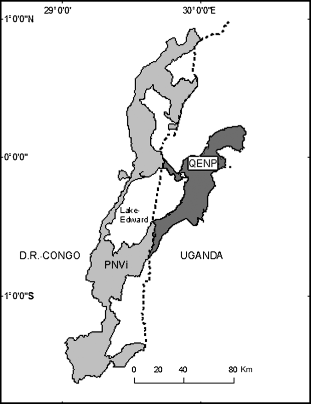 Fig. 1 Parc National des Virunga (PNVi) and Queen Elizabeth National Park (QENP) straddling Lake Edward and the national frontier (dotted north-south line) between Uganda and the Democratic Republic of Congo.