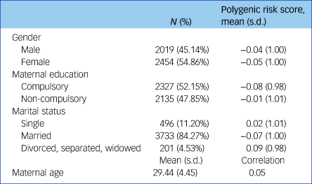 In our analyses, we accounted for population stratification by conducting principal component analyses and adjusting our models for population principal components as covariates. We also described our sample in relation to a number of child and family characteristics, including child's gender, maternal age, marital status (single/married/divorced, widowed or separated) and education (compulsory/non-compulsory education).
