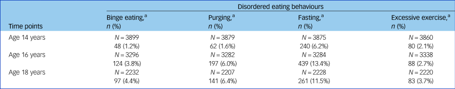 Table 2 shows the prevalence of disordered eating behaviours at age 14, 16 and 18 years. In line with the known epidemiology of eating disorders, prevalence of all behaviours was relatively low, but increased over time. All disordered eating behaviours were also more prevalent in girls compared with boys at all time points (data shown in Supplementary Table 1 available at https://doi.org/10.1192/bjp.2019.39).
