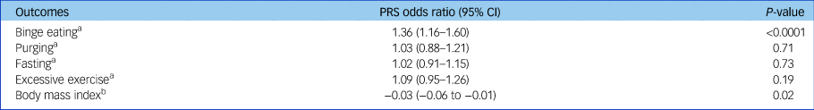 As shown in Table 3, in logistic regression models, we found strong evidence that a 1 s.d. increase in PRS for schizophrenia was associated with a 1.36 increase in the odds of binge eating (95% CI 1.16–1.60, P < 0.0001). Greater PRS were not associated with purging behaviours (odds ratio, 1.03; 95% CI 0.88–1.21; P = 0.71), fasting (odds ratio, 1.02; 95% CI 0.91–1.15; P = 0.73) or excessive exercise (odds ratio, 1.09; 95% CI 0.95–1.26; P = 0.19). Finally, an s.d. increase in PRS was associated with a −0.03 s.d. decrease in BMI (95% CI −0.06 to −0.01; P = 0.02), although evidence of this association was moderate to weak. We did not find any evidence of non-linear relationships when using quadratic PRS terms.