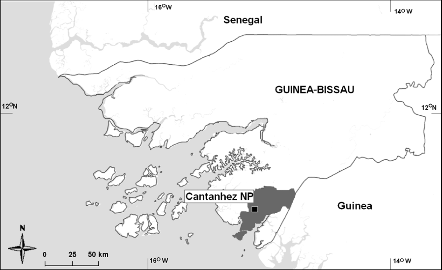 The 13,948 km2 Republic of Guinea-Bissau lies on Africa's north-western coast. Cantanhez National Park is in the south-west, in the Tombali Administrative Region (Fig. 1). Scattered within the 1,057 km2 Park are c. 110 villages, with a population density of c. 20 people km−2 (Temudo, Reference Temudo2009). Several primate species occur in the Park (Gippoliti & Dell'Omo, Reference Gippoliti and Dell'Omo1996): the western chimpanzee, colobus monkeys (Procolobus badius temmincki and Colobus polykomos), Guinea baboon Papio papio, grivet monkey Cercopithecus aethiops sabaeus, Campbell's monkey Cercopithecus campbelli and Senegalese galago Galago senegalensis.