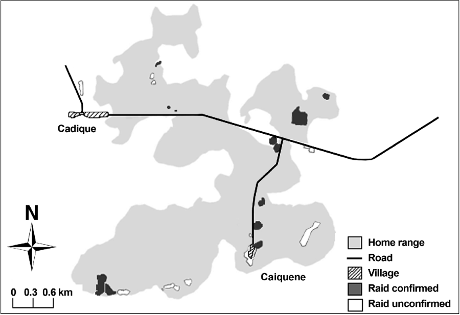 Fig. 2 The known home range of the Caiquene–Cadique chimpanzee Pan troglodytes verus community in the vicinities of the villages of Cadique and Caiquene. This area is a mixture of primary and secondary forest, mangrove, savannah and cultivated and fallow fields. Cashew fields are highlighted and categorized according to whether raiding was confirmed (through direct observations, traces or local reports) or unconfirmed.