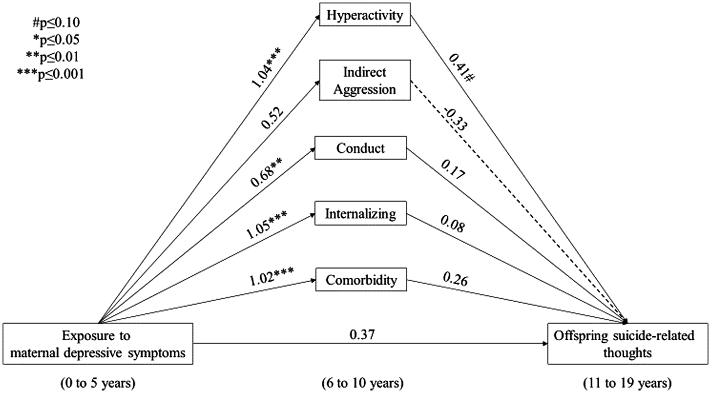 This study examined the mediating role of child psychiatric symptoms in the association between exposure to maternal depressive symptoms in childhood and adolescent SRT and SA using data from a Canadian population-based cohort. The largest EPMs were seen for symptoms of hyperactivity and inattention, accounting for approximately 60% of the associations between maternal depressive symptoms in childhood and offspring SRT and SA risk from 11 to 19 years of age. Psychiatric comorbid symptoms also mediated this relationship and accounted for 44 and 50% of this association with SRT and SA, respectively, while internalising symptoms accounted for 38% of this association with SA only. This study extends previous research by being prospective, establishing temporality, being nationally representative increasing external validity, and by clarifying the mediating role of child psychiatric symptoms occurring between 6 and 10 years of age specifically in comparison to other studies examining symptoms later in adolescence.