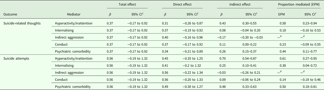 Fig. 3. Adjusted (offspring age in years at baseline, offspring stressful life event (4–10 years), socio-economic status, maternal and paternal binge drinking (0–10 years), offspring sex, sex by exposure interaction) β-coefficients of the total effects, and exposure–mediator associations, and mediator–outcome associations with suicide attempts as the outcome, weighted (inverse probability weights were used to produce estimates that accurately reflect the characteristics of the Canadian population in 1994/1995 (the baseline of the longitudinal cohort from the NLSCY), excluding full-time members of the Canadian Armed Forces, inmates of institutions and those residing (during the time of the survey) in Yukon, Nunavut, Northwest Territories and Indian reserves) to reflect the Canadian general population.