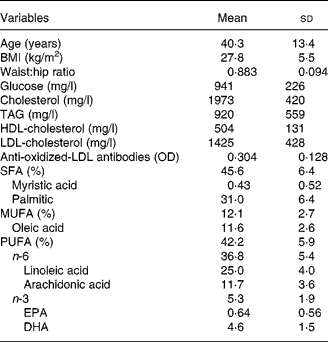 Table 1 shows the main anthropometric and laboratory values in the overall sample. The levels of anti-oxidized-LDL antibodies correlated significantly with age (r − 0·341, P < 0·001), BMI (r − 0·239, P < 0·001), waist:hip ratio (r − 0·285, P < 0·001), glucose (r − 0·208, P < 0·001), cholesterol (r − 0·243, P < 0·001), LDL-cholesterol (r − 0·185, P = 0·002), serum phospholipid EPA (r − 0·159, P = 0·003), DHA (r − 0·121, P = 0·026), and the sum of the n-3 PUFA (r − 0·141, P = 0·009). The levels of anti-oxidized-LDL antibodies did not correlate significantly with the levels of TAG, HDL-cholesterol, the sum of the SFA, serum phospholipid myristic acid, serum phospholipid palmitic acid, serum phospholipid linoleic acid, serum phospholipid arachidonic acid or the sum of the serum phospholipid n-6 PUFA.
