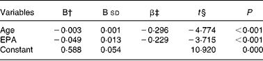 Table 2 Multiple regression analysis with the overall sample where the dependent variable is level of anti-oxidized-LDL antibodies and independent variables are age, BMI, waist:hip ratio, cholesterol, TAG, HDL-cholesterol, LDL-cholesterol, myristic acid, arachidonic acid, oleic acid, linoleic acid, DHA, EPA and palmitic acid*