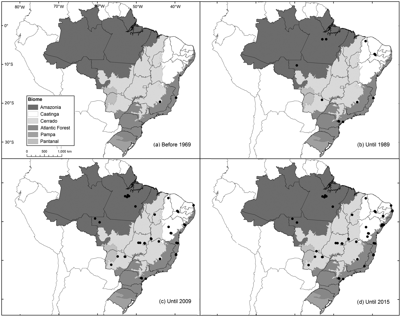 Fig. 1 Spatial evolution of records of the Brazilian funnel-eared bat Natalus macrourus (Natalidae) from 1893 to 2015.