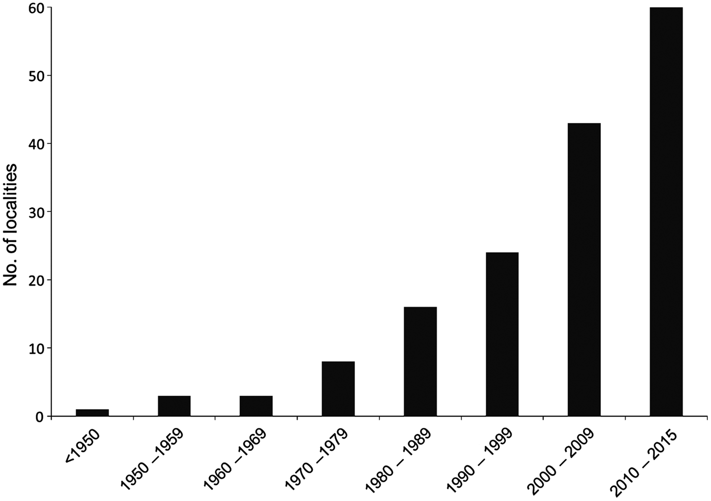 Fig. 2 Temporal evolution of the number of localities with known records of the Brazilian funnel-eared bat in Brazil from 1893 to 2015.