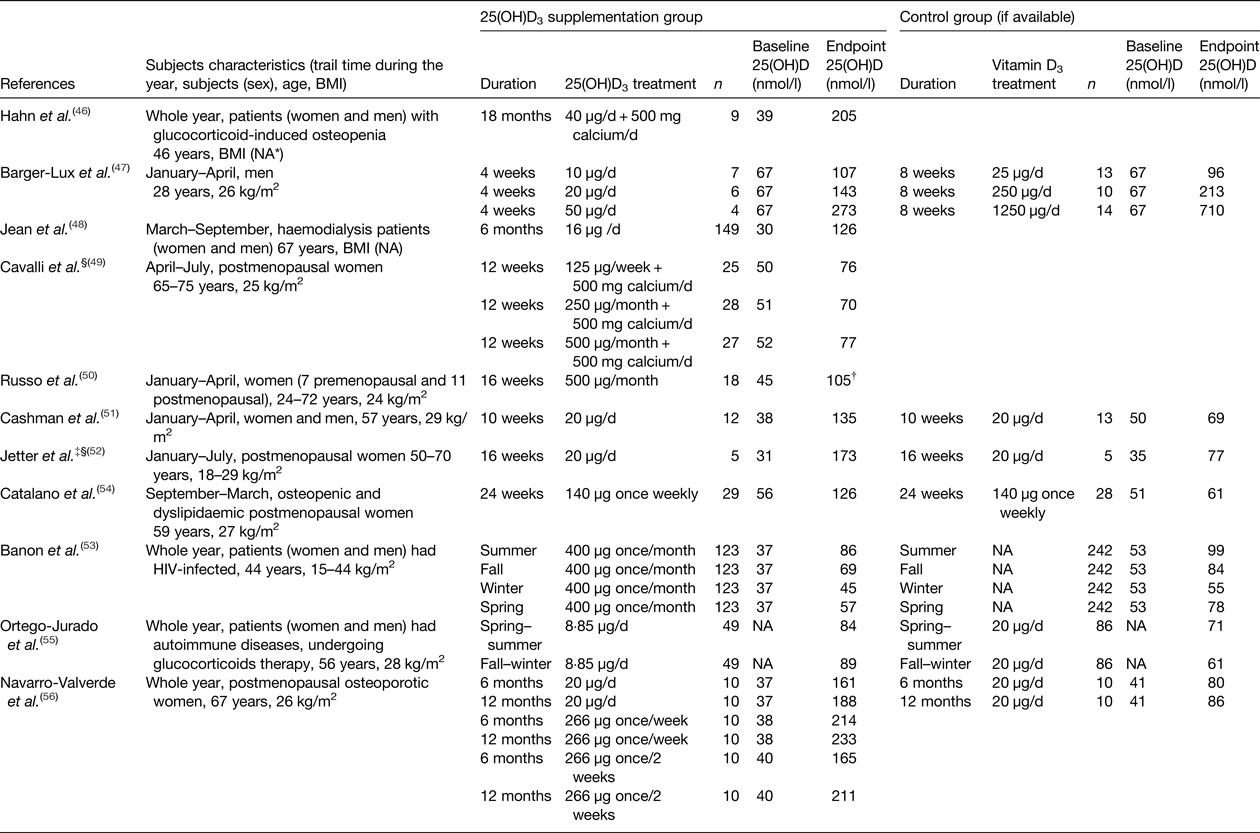 For patients with different diseases and receiving long-term medication, studies(Reference Mehrotra, Kermah and Budoff63–Reference Griz, Bandeira and Diniz65) showed that several drugs (e.g. antiepileptic agents, glucocorticoids, antiretroviral or anti-oestrogen drugs) interfered with vitamin D metabolism, which resulted in patients being more likely to have low vitamin D status. Thus, it is not only important to increase vitamin D status in the generally healthy population but also in patients with specific illnesses and receiving certain medication. Therefore, the studies using 25(OH)D3 treatments in patients were also summarised in Table 4(Reference Hahn, Halstead and Teitelbaum46, Reference Jean, Terrat and Vanel48, Reference Banon, Rosillo and Gomez53–Reference Navarro-Valverde, Sosa-Henriquez and Alhambra-Exposito56), and those studies consistently reported that chronic 25(OH)D3 supplementation effectively increased serum 25(OH)D concentrations. For example, Ortego-Jurado et al. showed a lower daily dose of 8·85 µg 25(OH)D3 to be more effective than a 20 µg dose of vitamin D3 for increasing vitamin D status in patients with autoimmune disease who were treated with a low dose of glucocorticoids throughout the year(Reference Ortego-Jurado, Callejas-Rubio and Rios-Fernandez55). Similarly, the study of Banon et al. showed that a monthly dose of 400 µg 25(OH)D3 was safe and effective at improving vitamin D status of HIV-infected patients throughout the year(Reference Banon, Rosillo and Gomez53).