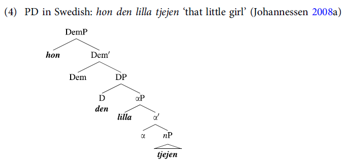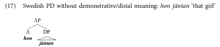 To sum up, we have presented two syntactic structures, one for Swedish PDs and one for Norwegian PDs. The Norwegian structure, in which han/hun sits in DDem, clearly implies that the pronoun han/hun has taken on a function as a proper demonstrative; PDs are different from other demonstratives in that they can only be used in reference to persons and in that they convey a psychologically distal meaning, but in terms of structure, they are very similar. For Swedish, it follows from our analysis that the term ‘pronominal demonstrative’ is not entirely justified, as the pronouns han/hon are not in a demonstrative position; recall (8) above.