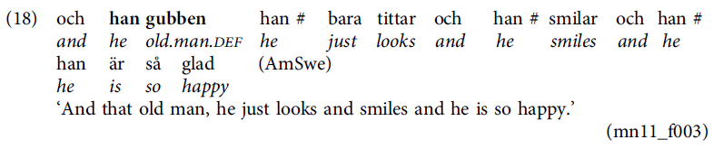 For AmSwe, the amount of available speech data that can shed light on the status of PDs is, unfortunately, quite small; CANS includes 22 Swedish speakers, producing 45,000 word tokens. As expected in a sample of this size, there are not many PDs to be found. We note that PDs are attested in AmSwe with one example, uttered by a third-generation heritage speaker, shown in (18):Footnote 30