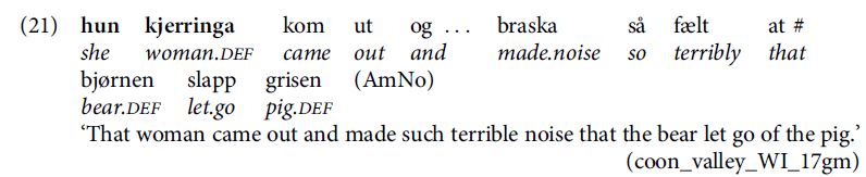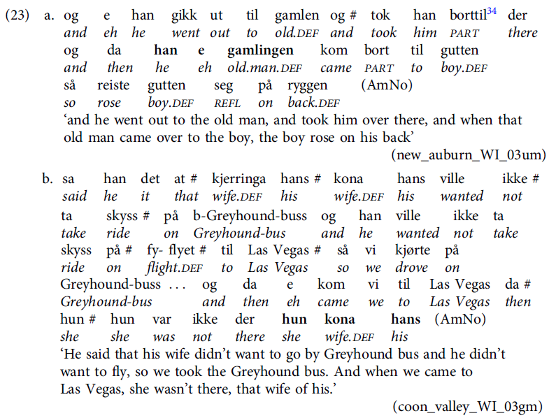 As shown in Section 2, PDs in EurNo are not only used to introduce referents, but also with referents that have been mentioned previously in the discourse (see Johannessen Reference Johannessen, Næss, Margetts and Treis2020; recall that this is less common in Swedish). This use is found in AmNo, too; two examples, one from the 1940s and one from the 2010s, are given in (23) ((23b) = (22c)):