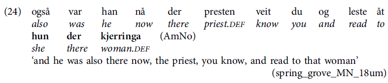 There are no examples of PDs with definite noun phrases with adjectival modification in our heritage language data.Footnote 35 Since we do not have access to acceptability judgments for AmNo, we cannot know for certain that PDs in AmNo are incompatible with a prenominal determiner or demonstrative, as they are in EurNo (see Section 2.1).Footnote 36 However, given that the usage in AmNo looks very much like EurNo, rather than EurSwe, we expect AmNo PDs to have the same syntax as PDs in EurNo; nothing suggests grammatical change with respect to PDs. Notably, the fact that AmNo PDs can be reinforced with a locative der ‘there’ as in (24) also corroborates the analysis of the PDs as proper demonstratives; the example in (24) was recorded in the 1940s.