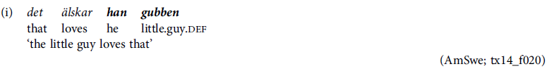 In this paper, we offer a new, comparative view on PDs in Scandinavian, based on data sets that were not available at the time of Johannessen’s seminal works. In the first part of the paper, we present new observations on the history of PDs in Scandinavian, differences between PDs in Norwegian and Swedish, and a revision of Johannessen’s account. We show that Swedish has a more restricted use of PDs than Norwegian, but in fact allows the PD to co-occur not only with a determiner, but also with another demonstrative. Based on these observations, we propose that Swedish han/hon in the relevant contexts are not true demonstratives (although, for simplicity, we keep referring to them as PDs). On our account, Swedish PDs are syntactically reduced pronouns, located in a high position (above demonstratives), doubling certain features that are found further down in the extended nominal projection (see Josefsson Reference Josefsson and van Riemsdijk1999, Reference Josefsson2006; van Craenenbroeck & van Koppen Reference van Craenenbroeck and van Koppen2008). We further assume that they have logophoric features (Sigurðsson Reference Sigurðsson2011, Reference Sigurðsson2014) that activate shared knowledge between the speaker and addressee.