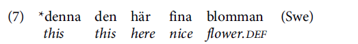 A clear difference between Norwegian and Swedish, which motivated the different syntactic structures proposed by Johannessen (Reference Johannessen2008a), concerns the interplay between PDs and prenominal definite determiners (see Section 1 above; the prenominal definite determiner is used when a noun is modified by an adjective). In Swedish (Swe), as opposed to Norwegian, a PD and a prenominal definite determiner can be combined, as illustrated in (3) (see also Johannessen Reference Johannessen2008a:176, 178):