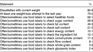 Over 80 % of the participants were dissatisfied with their current body weight, and the majority had made at least one weight-loss attempt in the last year (Table 4). The majority of the participants (66·1 %) reported reading food labels often or sometimes to select healthier foods. Participants were most likely to use nutritional labels to check the sugar content (58·9 %), followed by the fat content (49·2 %) and the salt content (21 %) of foods. A minority of the participants checked foods for their energy content (12·1 %), carbohydrate content (11·3 %) or glycaemic index (2·4 %) (Table 4).