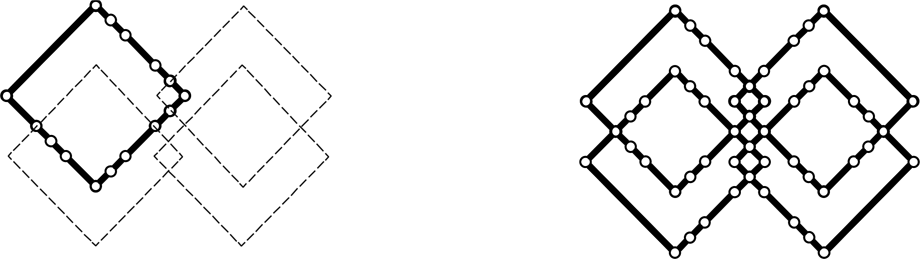 Fig. 28. The square now obtains three discrete topologies in C2, including four, four (left), and eight linear segments (right) of various lengths.