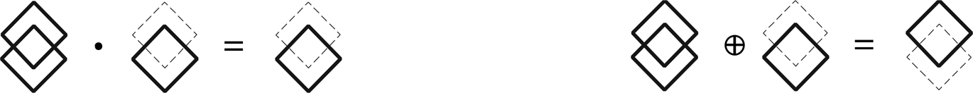 The product (•) of two shapes, a • b, is the largest shape having parts that are common to a and b and nothing else. Moreover, the symmetric difference is the largest shape made of all parts of a that have no common parts with b and all parts of b with no common parts with a. It is defined based on sum and difference: a ⊕ b = (a − b) + (b − a) (Fig. 4).