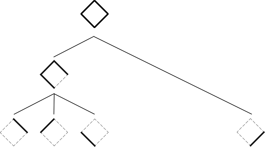 Discrete and bounded decompositions can be extended to other algebraic structures able to handle computational continuity and the recasting of computations with shapes into computations with atoms. Stiny (Reference Stiny1994) uses decompositions that are topologies and Boolean algebras. Krstic (Reference Krstic2010) uses hierarchies and topologies. Hierarchies have wide use in engineering. They describe designs and their components as sums of atoms. Hierarchies are ordered sets with unique paths between their elements, providing a global structure for shapes and presenting how parts are assembled. A shape is decomposed hierarchically by breaking it down into discrete parts and subparts. The result is a treelike structure with the whole shape at the top and the atoms at the bottom. The following diagram with a square presents a hierarchy containing two components: a Π and an I. The atoms of the hierarchy are four maximal lines (Fig. 7).
