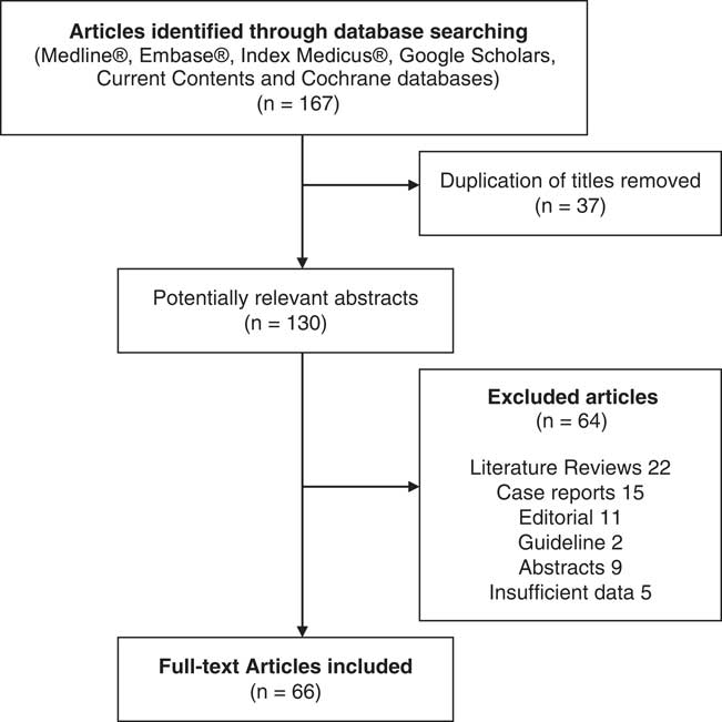 A total of 167 articles were identified, and after titles and abstracts were reviewed, we excluded 101 documents. Among them, 66 full-text articles were reviewed, including original articles, clinical trials and meta-analysis (see Figure 1).