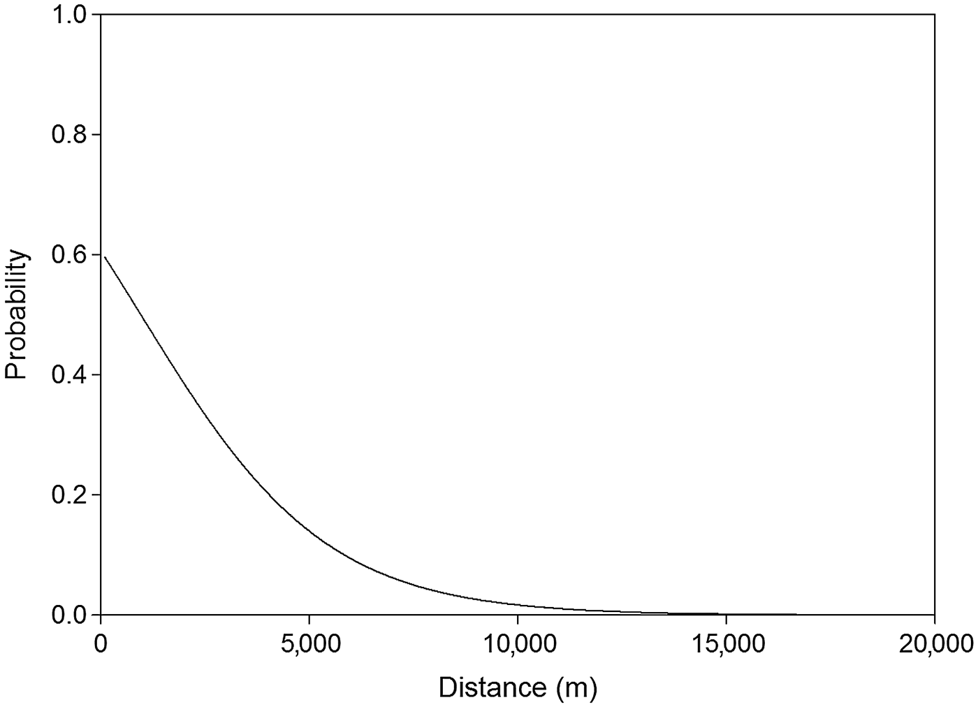 Fig. 2 Probability of detection of dog tracks as a function of distance to the anthropogenic edge of Doñana National Park (Fig. 1) during the wet seasons of 2007–2008 and 2008–2009.