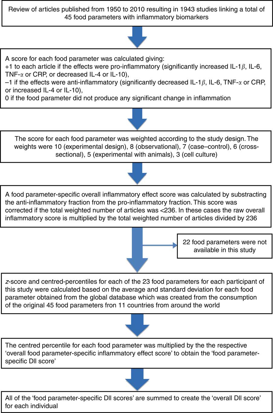 The development( Reference Shivappa, Steck and Hurley 17 ) and validation( Reference Shivappa, Steck and Hurley 22 ) of the DII has been explained elsewhere. Through evaluation of peer-reviewed literature published from 1950 to 2010, the score is based on 1943 articles linked to forty-five individual nutrient, food or flavonoid intake parameters. Points were assigned to each of these parameters according to whether they increased (+1), decreased (−1) or had no (0) effect on six established inflammatory biomarkers: IL-1b, IL-4, IL-6, IL-10, TNF-α and CRP. The score for each of the food parameters was weighted according to the study designs and total number of research articles. Overall parameter-specific inflammatory effect scores were then calculated based on the ratio of the total weighted number of articles:the weighted pro- and anti-inflammatory articles for each parameter followed by subtracting the anti-inflammatory fraction from the pro-inflammatory fraction. Parameters that had a robust pool of literature, that is greater than the median number of 236 weighted articles, were assigned the full value of that score. Parameters with a number of weighted articles <236 were adjusted according to the distance of their number from this median.