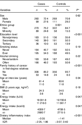 Table 1 Comparison of participant characteristics and dietary inflammatory index between case and control groups, Xinjiang, China, January 2008–December 2009 (Numbers and percentages; mean values and standard deviations; medians and interquartile ranges (IQR))