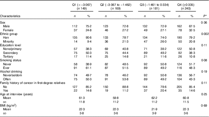 Table 2 Participant characteristics across quartiles (Q) of dietary inflammatory index (DII) among all participants, Xinjiang, China, January 2008–December 2009 (Numbers and percentages; mean values and standard deviations)
