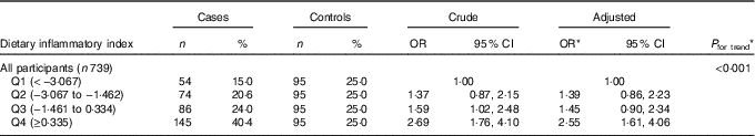 The results of logistic regression analyses are shown in Table 3. A higher DII score (indicating a more pro-inflammatory diet) was associated with an increased risk of oesophageal cancer, with a significant dose–response relationship (P trend<0·001). The adjusted OR was 2·55 (95 % CI 1·61, 4·06) for participants in the highest quartile of DII scores compared with those in the lowest quartile. Belonging to an ethnic minority group (adjusted OR 1·86; 95 % CI 1·24, 2·80), having a family history of oesophageal cancer (adjusted OR 2·74; 95 % CI 1·60, 4·66), an education level lower than secondary school (adjusted OR 1·82; 95 % CI 1·09, 3·06) and smoking (adjusted OR 1·59; 95 % CI 1·07, 2·36) also were significantly and independently associated with an elevated risk of oesophageal cancer. None of their interactions with DII was found to be significant.