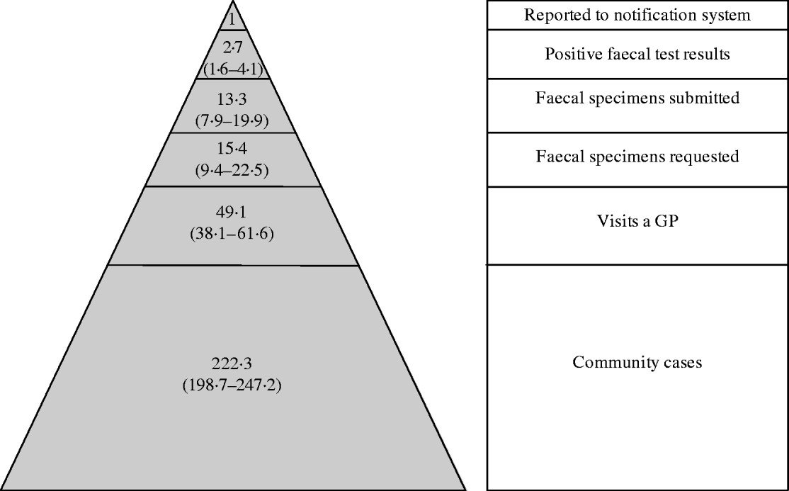 Acute gastrointestinal illness (AGI) is a common cause of illness in New Zealand as in other countries and carries a large human and economic cost [Reference Lake1]. New Zealand has a notifiable disease surveillance system that provides information generated from patients presenting to a medical practitioner. Many of these notifiable diseases present as AGI. It is generally accepted that these patients represent a small fraction of the total community AGI burden and a number of studies have elucidated the broader picture in terms of a disease pyramid for specific countries [Reference Majowicz2–Reference Hall6]. Such pyramids quantitatively depict the under-ascertainment of cases at each step of the pathway [general practitioner (GP), clinical laboratory, notifiable disease system] leading to an AGI-related notified illness.